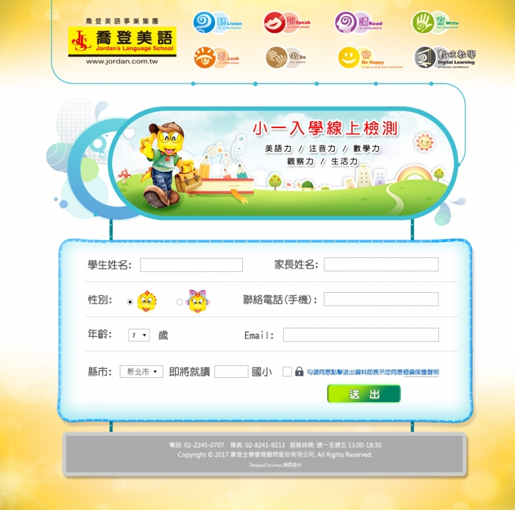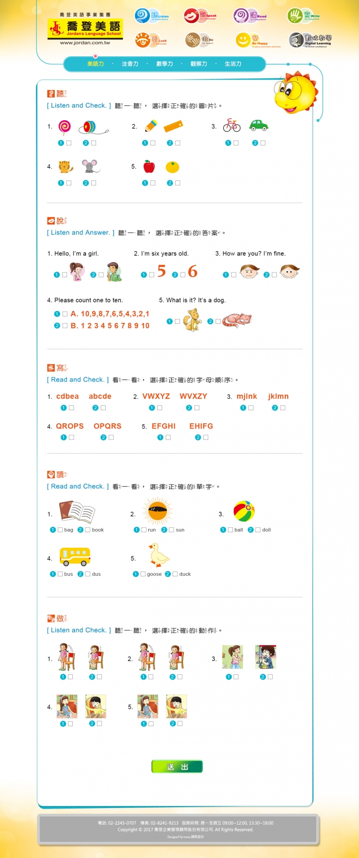 數位時代來臨,學美語只靠傳統教學方法、教材、教具已經不夠,喬登首創全國第一套多媒體動畫影音歌唱遊戲互動式數位教學, 創造更生動更活潑更歡樂的學習情境,讓老師和孩子的學習情緒更高昂,學習效果更肯定。教室裡,老師透過寬頻網路和喬登美語教學網 www.jordan.com.tw 連結,將所有上課的內容,以單槍投影機投射在教室的大螢幕上,小朋友的座位四周也有數台最先進的 LCD 液晶電腦隨時等著小朋友在老師的帶領下進入喬登美語教學網,進行劃時代全新的數位教學。