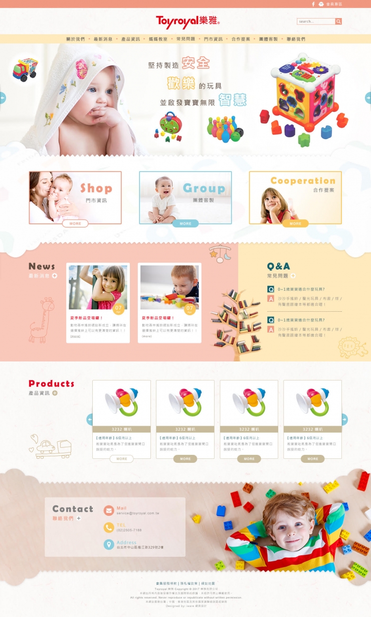 全部作品 精選作品 企業形象 購物網站 投審稿系統 客製平台 醫療美容 餐飲旅宿 教育/協會/政府 活動網站 RWD響應式 賀卡 3D環景攝影 首頁 iWare作品 樂雅玩具 樂雅玩具 介紹 1916年,Toyroyal樂雅玩具誕生於日本東京,為國際知名的百年嬰幼兒玩具品牌,我們將玩具視為一種重要的教育媒介。2017年,我們以全新概念『寶寶探索成長樂園』為主軸,從0~3歲規劃出七個遊戲主題;在寶寶每個重要的成長關鍵階段,Toyroyal樂雅都有適合的玩具陪伴寶寶成長與生活探索。 製作團隊:規劃/Lori, 設計/Trista, 前端/Trista, 程式/Miku 功能項目 產品上架 消息發佈 課程介紹 線上報名 產業分類 精選作品 RWD響應式 形象型網站 毛孩食務所 購物網站 專業型網站 漢泰生醫 精選作品 醫療美容 RWD響應式