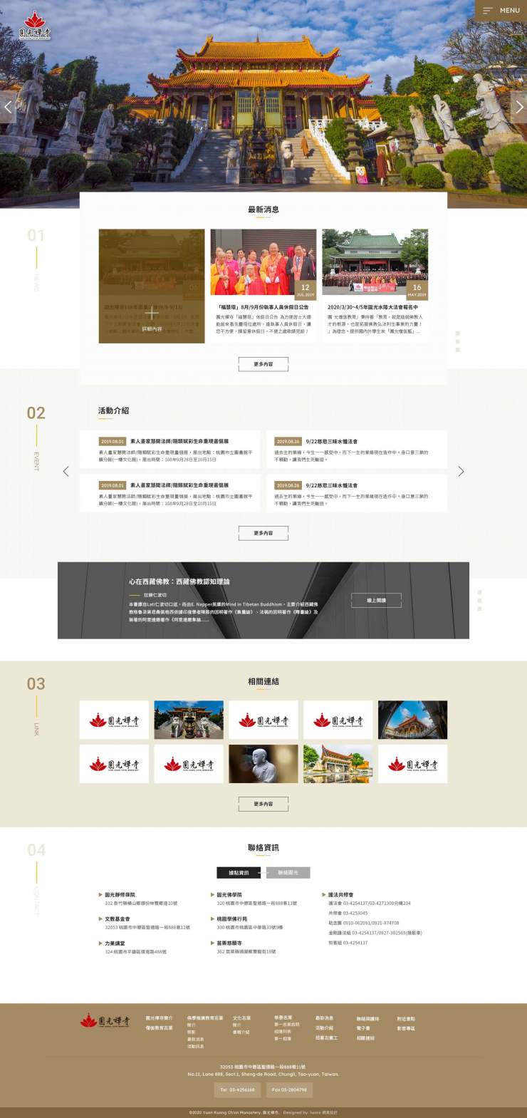 全部作品 精選作品 企業形象 購物網站 投審稿系統 客製平台 醫療美容 餐飲旅宿 教育/協會/政府 活動網站 RWD響應式 賀卡 3D環景攝影 首頁 iWare作品 財團法人圓光文教基金會-圓光禪寺 財團法人圓光文教基金會-圓光禪寺 介紹 圓光禪寺的整體規劃乃是遵照傳統的叢林規制。在典雅的綠瓦白牆圍繞下,莊嚴宏偉的北方的宮殿式建築和雅緻的庭園設計,構成絕佳的景色,宛如人間仙境。在側門上塑有斑鹿盤踞法輪像,象徵世尊最初在鹿野苑對五比丘轉四諦法輪,此正和院長發心振興僧教育的行願相輝映。 製作團隊:規劃/Hannah、 設計/Trista、程式/Billy、Akira 功能項目 圓光禪寺簡介 最新消息 課程活動 相簿剪影 電子書 據點分布 景點介紹 招募志工 影音專區 教育志業 聯絡我們 產業分類 RWD響應式 教育/協會/政府 原創功能型網站 立侑螺絲工業有限公司 企業形象 RWD響應式 社團法人中華民國心臟學會(TSOC)-年會官網 RWD響應式 教育/協會/政府 原創功能型網站