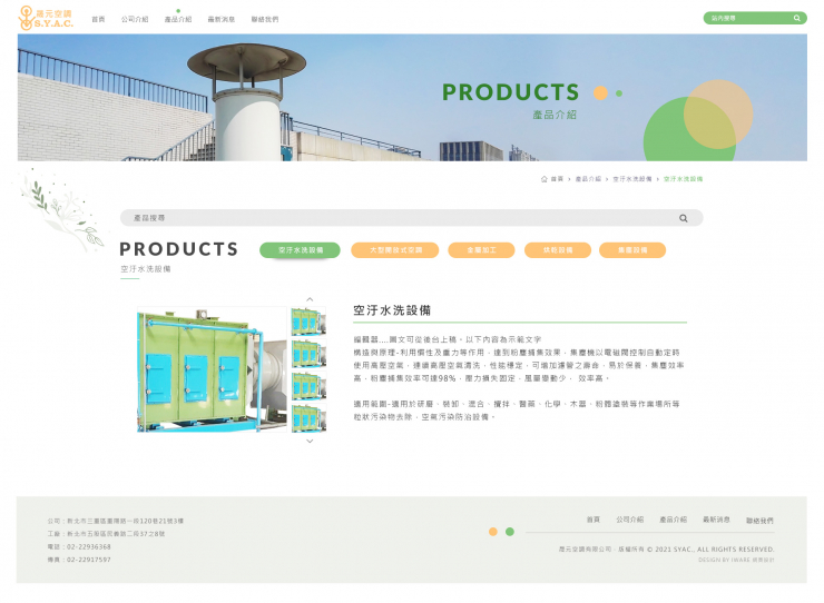 全部作品 精選作品 企業形象 購物網站 投審稿系統 客製平台 醫療美容 餐飲旅宿 教育/協會/政府 活動網站 RWD響應式 賀卡 3D環景攝影 首頁 iWare作品 晟元空調有限公司 晟元空調有限公司 介紹 晟元空調成立1992年,主要因應客戶需求,擴大營業項目,由原來單純零件加工廠,金屬製作,擴充為一貫作業加工廠,開發各型空調產品、專業製作。由於不斷創新、研發,擁有多項專利,對整體產業貢獻良多,更將傳統空調產業提升,與科技接軌,投入環境污染處理設備研發與製造。 規劃David、設計 Winnie、前端Trista、程式育偉 功能項目 RWD網站 公司介紹 產品介紹 最新消息 聯絡我們 產業分類 企業形象 RWD響應式 樂久旅行社有限公司 精選作品 餐飲旅宿 RWD響應式 原創功能型網站 臺北醫學大學-生醫產學聯盟 教育/協會/政府