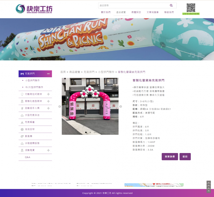 全部作品 精選作品 企業形象 購物網站 投審稿系統 客製平台 醫療美容 餐飲旅宿 教育/協會/政府 活動網站 RWD響應式 賀卡 3D環景攝影 首頁 iWare作品 快樂工坊 快樂工坊 介紹 You Dream It, We Make It ! 『將心比心,做到最好!』 快樂工坊投入很多製作充氣材質研發及充氣結構研究,擁有多項專利。從傳統產業中,利用材料特性及不同場所的各種不同應用,把靜態結構擬真細緻。讓氣球不只是氣球,打造無限可能的氣體世界。 製作團隊:規劃/Amber, 設計/Winnie, 程式/Carol 功能項目 RWD網站 關於我們 產品介紹 媒體採訪 文章知識庫 聯絡我們 產業分類 企業形象 RWD響應式 門諾醫院公益網站 精選作品 醫療美容 RWD響應式 星加電機工業有限公司 企業形象 形象型網站