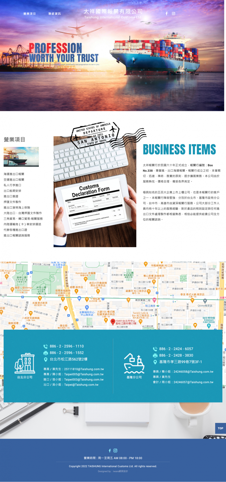 全部作品 精選作品 企業形象 購物網站 投審稿系統 客製平台 醫療美容 餐飲旅宿 教育/協會/政府 活動網站 RWD響應式 賀卡 3D環景攝影 首頁 iWare作品 太祥國際報關有限公司 太祥國際報關有限公司 介紹 太祥報關行專營進、出口海運報關。。服務項目計有:進出口報關、報關行推薦、海運空運、三角貿易、貨運物流、內陸運輸、進出口證、大陸出口文件、台灣押匯文件、出口船期安排,報關行成立之初,本著親切,迅速,準時,務實的原則, 逐步擴展業務。 製作團隊:規劃/Hannah, 設計/Ringo、Winnie 功能項目 動態視覺 一頁式網站 RWD自適性 聯絡我們 產業分類 企業形象 RWD響應式 核桃運算股份有限公司 企業形象 RWD響應式 高狄工業有限公司 企業形象