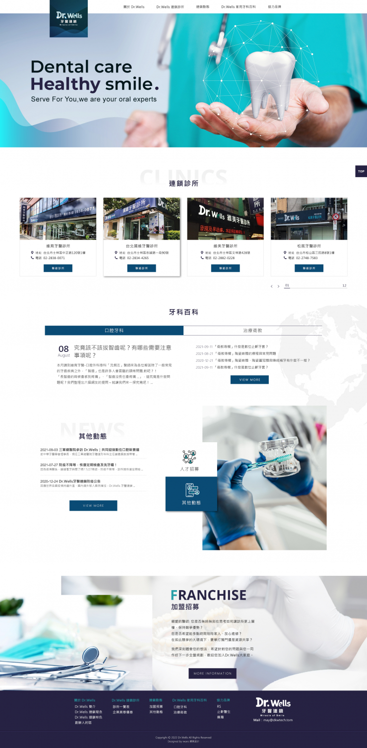 全部作品 精選作品 企業形象 購物網站 投審稿系統 客製平台 醫療美容 餐飲旅宿 教育/協會/政府 活動網站 RWD響應式 賀卡 3D環景攝影 首頁 iWare作品 Dr. Wells 牙醫連鎖 Dr. Wells 牙醫連鎖 介紹 規劃/Lori, 視覺&前端/Peng & Trista, 程式/Carol 功能項目 關於 Dr.Wells Dr.Wells 連鎖診所 連鎖動態 Dr.Wells 家用牙科百科 協力品牌 產業分類 企業形象 RWD響應式 楹濰橡膠有限公司 企業形象 RWD響應式 台灣村田板金企業有限公司 企業形象 RWD響應式