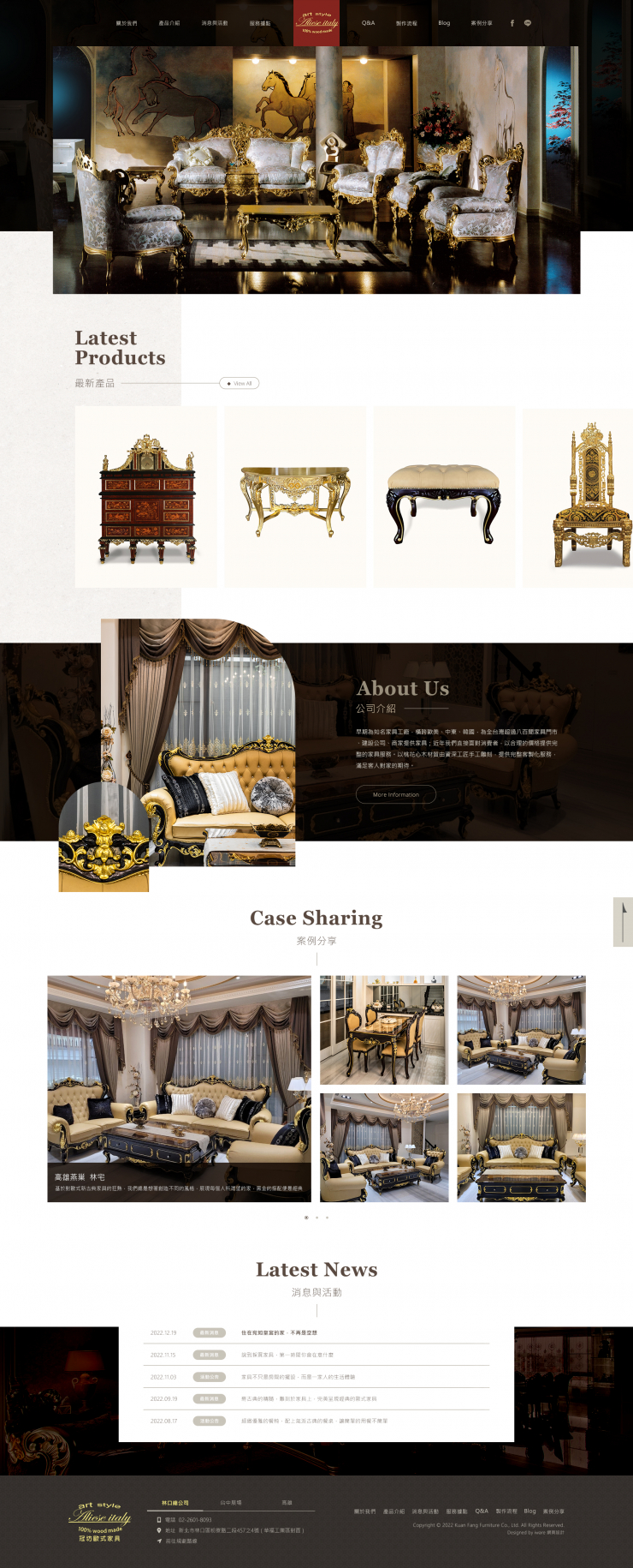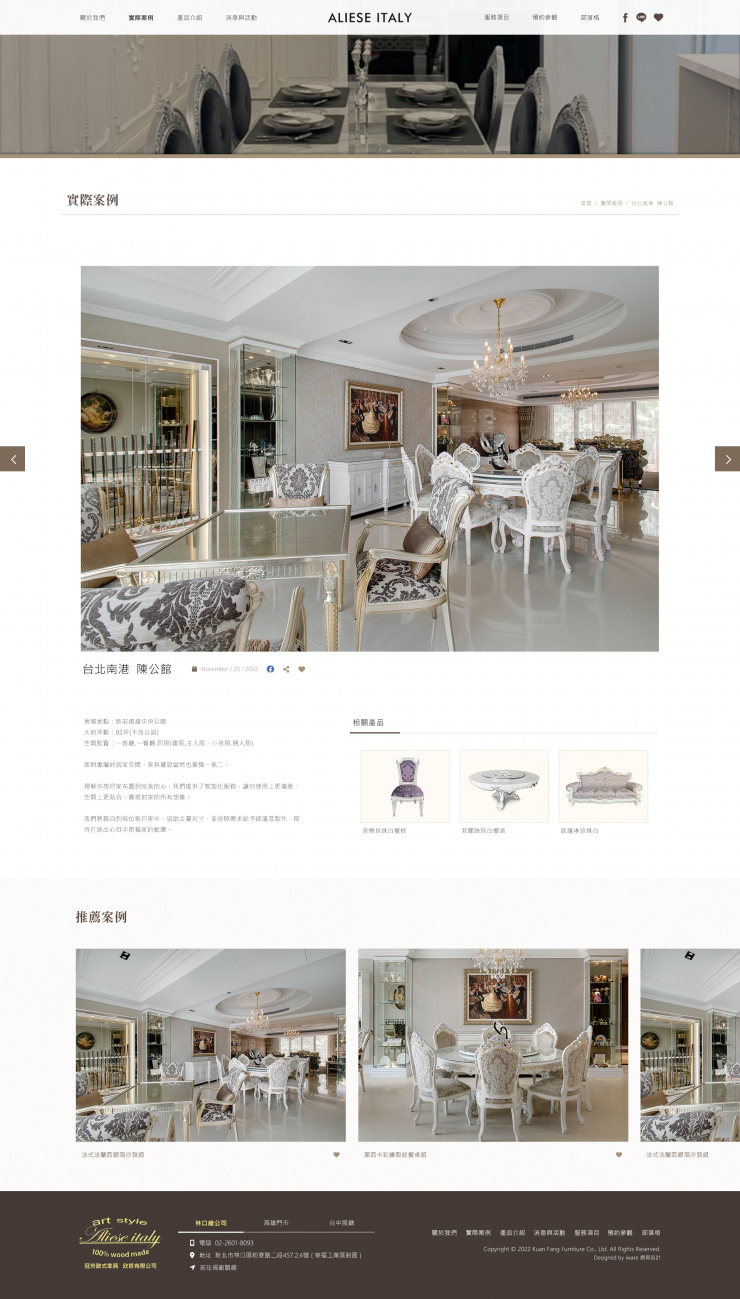 全部作品 精選作品 企業形象 購物網站 投審稿系統 客製平台 醫療美容 餐飲旅宿 教育/協會/政府 活動網站 RWD響應式 賀卡 3D環景攝影 首頁 iWare作品 冠坊歐式古典家具 冠坊歐式古典家具 介紹 在台北、台中開設冠坊歐式古典傢俱展示中心,高雄設立欣哲古典家具門市,為代理ALIESE義大利品牌的古典傢俱批發商,每件歐式家具堅持使用合法原木和知名的環保材料,為您的家居生活帶來安全與舒適的品質保障。 規劃/Lori, 視覺&前端/Peng Peng & Karen, 程式/Carol 功能項目 關於我們 實際案例 產品介紹 消息與活動 服務項目 預約參觀 部落格 心願清單 產業分類 精選作品 RWD響應式 台灣肝臟研究學會 2024 APASL STC on MAFLD年會網站 精選作品 醫療美容 RWD響應式 投審稿系統 楹濰橡膠有限公司 企業形象 RWD響應式
