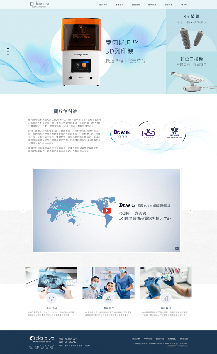 全部作品 精選作品 企業形象 購物網站 投審稿系統 客製平台 醫療美容 餐飲旅宿 教育/協會/政府 活動網站 RWD響應式 賀卡 3D環景攝影 首頁 iWare作品 德科維聯合科技股份有限公司 德科維聯合科技股份有限公司 介紹 製作團隊 規劃/Lori, 視覺 Peng、Zone / 前端Karen, 程式/Carol 功能項目 幻燈片管理 產品管理 單層網頁生成管理 二層網頁生成管理 聯絡我們管理 產業分類 精選作品 醫療美容 RWD響應式 土城澄美牙醫診所 精選作品 醫療美容 RWD響應式 RS牙科植體系統(RS Implant System) 精選作品 醫療美容 RWD響應式