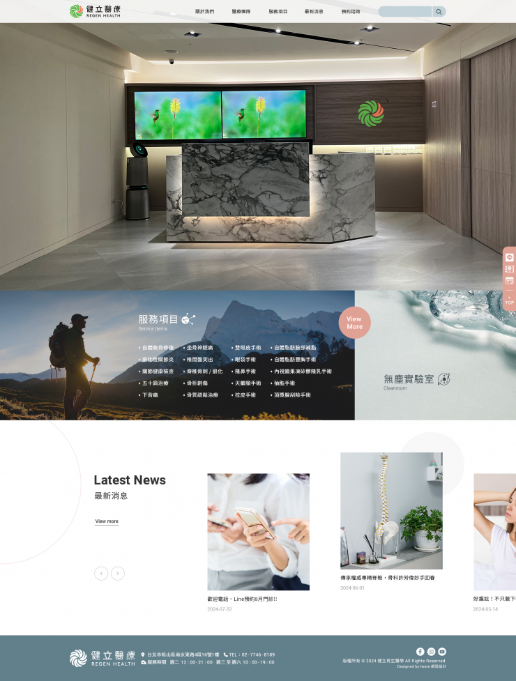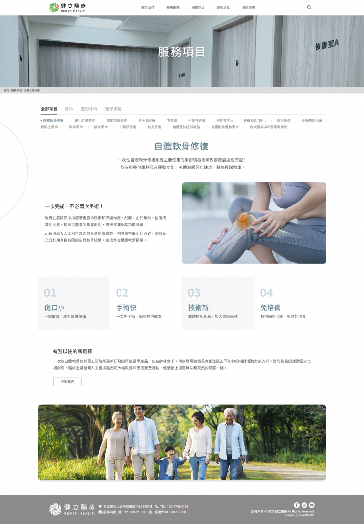 全部作品 精選作品 企業形象 購物網站 投審稿系統 客製平台 醫療美容 餐飲旅宿 教育/協會/政府 活動網站 RWD響應式 賀卡 3D環景攝影 首頁 iWare作品 健立醫療Regen Health 健立醫療Regen Health 介紹 規劃/Lori, 視覺/Peng, 前端/Trista, 程式/ Johnnie 功能項目 靜態內頁設計 幻燈片管理 單層頁面管理 多層管理模組 預約表單模組 產業分類 企業形象 醫療美容 RWD響應式 發現者旅行社 精選作品 餐飲旅宿 RWD響應式 財團法人圓光文教基金會 湧泉圖書館 企業形象 RWD響應式 教育/協會/政府