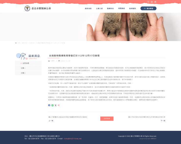 全部作品 精選作品 企業形象 購物網站 投審稿系統 客製平台 醫療美容 餐飲旅宿 教育/協會/政府 活動網站 RWD響應式 賀卡 3D環景攝影 首頁 iWare作品 臺北市獸醫師公會 臺北市獸醫師公會 介紹 製作團隊:規劃/Amber, 視覺&前端/Peng, Trista, 程式/Carol 功能項目 最新消息 公會介紹 醫療新知 相關連結 動物醫院 會員專區(註冊/登入/資料修改/忘記密碼/會費繳納與紀錄/報名查詢) 法令規範 研討會 / 活動行事曆 下載專區 公佈欄 WSAVA專區 / 會刊 產業分類 精選作品 RWD響應式 教育/協會/政府 中華民國室內裝修專業技術人員學會 精選作品 RWD響應式 教育/協會/政府 中研院永續科學中心 精選作品 RWD響應式 教育/協會/政府